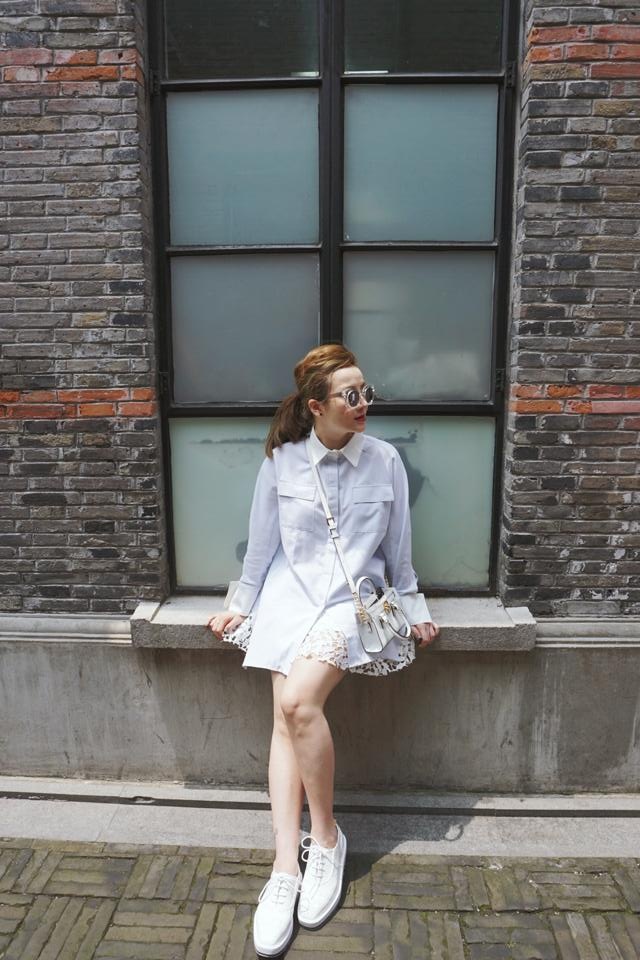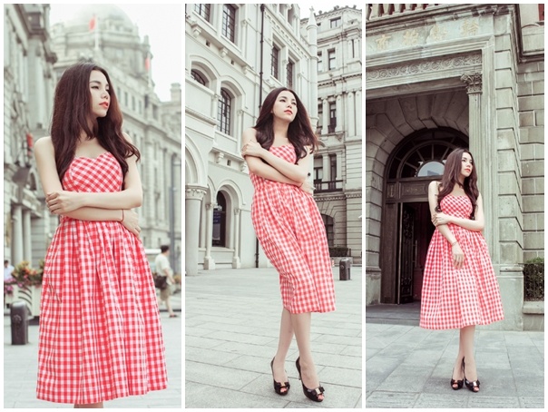 Trà Ngọc Hằng chọn mốt váy cổ điển khi đi dạo trên đường phố Thượng Hải.