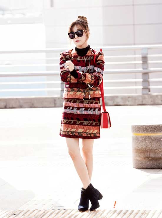 | Cô nàng được mệnh danh là “mắt cười đẹp nhất Kpop” nổi bật với bộ đồ họa tiết kết hợp túi xách đỏ rực rỡ. Mái tóc búi cao và kính mắt thời trang góp phần tạo cho cô diện mạo của một quý cô sang chảnh. |