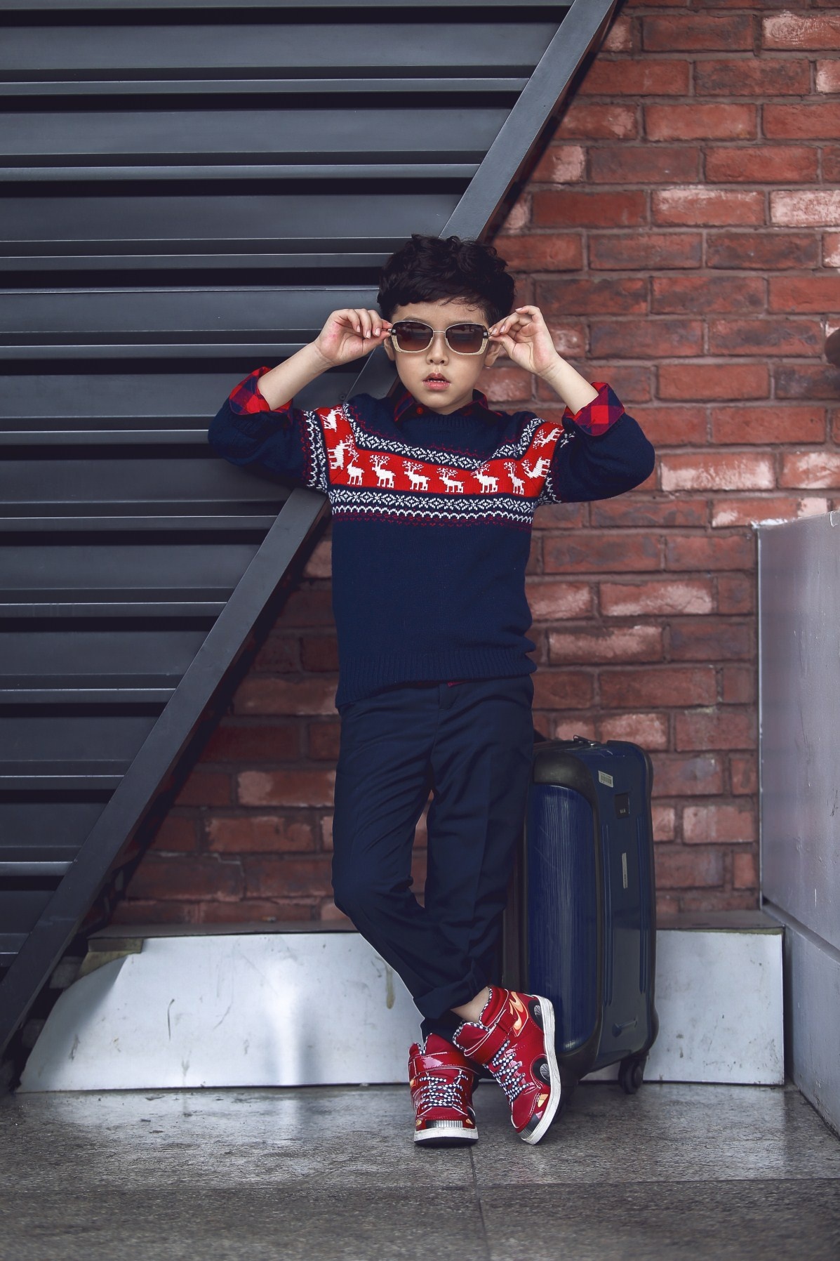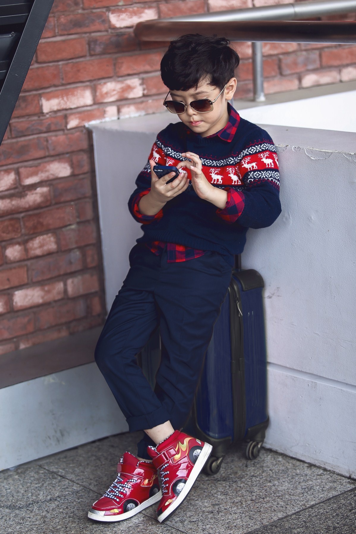 | Ở set đồ khác, nhóc tỳ chọn phong cách thu đông hiện đại, kết hợp giữa gam màu tối ăn ý, áo len nhấn nhá họa tiết màu đỏ đồng điệu cùng giày bata đồng màu. |