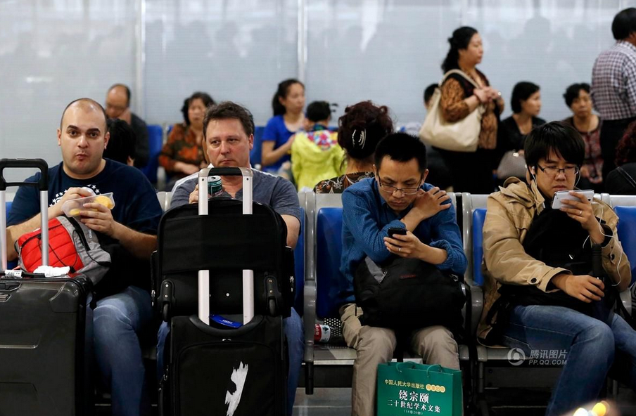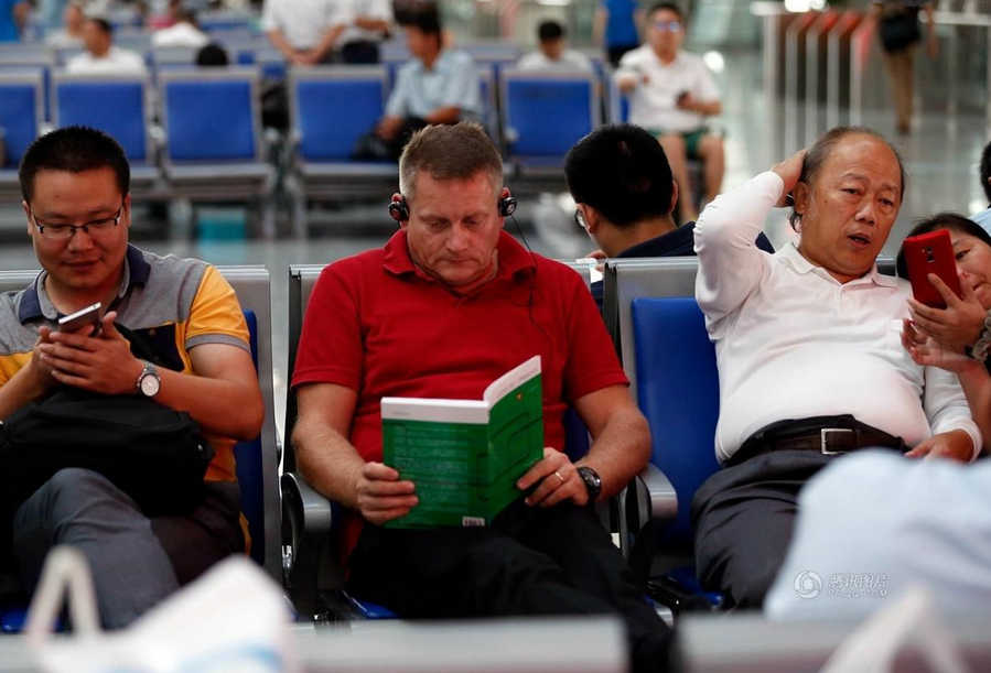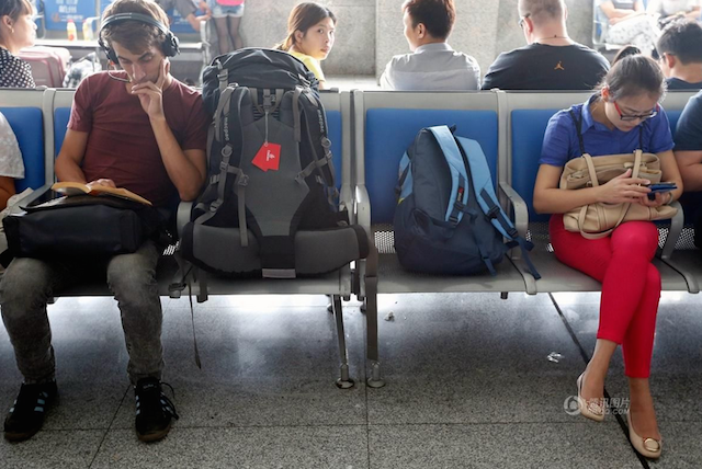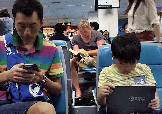 | Các bức ảnh này được chụp tại một sân bay ở Bangkok, Thái Lan. Hai người châu Á mải mê với thiết bị trên tay, còn người đàn ông tóc vàng ở phía sau đang đọc sách |