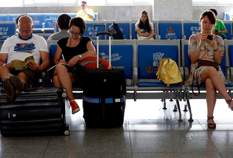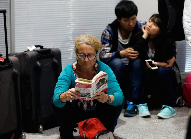 | Một phụ nữ tóc vàng đọc sách dù đang phải ngồi chờ trong tình trạng bất tiện. Ngay phía sau bà là một đôi nam nữ châu Á, với chiếc điện thoại thông minh trên tay. |