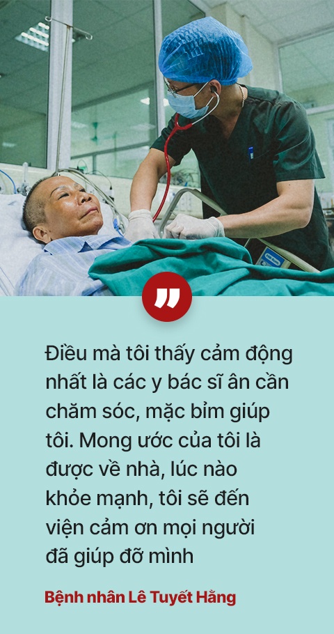 Trên giường bệnh, nữ bệnh nhân tỉnh táo, có thể tiếp xúc, nói chuyện với phóng viên. "Điều mà tôi thấy cảm động nhất là các y bác sĩ ân cần chăm sóc, mặc bỉm giúp tôi. Mong ước của tôi là được về nhà, lúc nào khỏe mạnh, tôi sẽ đến viện cảm ơn mọi người đã giúp đỡ mình. Nhờ sự cố gắng của mọi người mà tôi được sống tiếp. Tôi phải cố gắng để nhanh khỏe", bệnh nhân 19 chia sẻ.