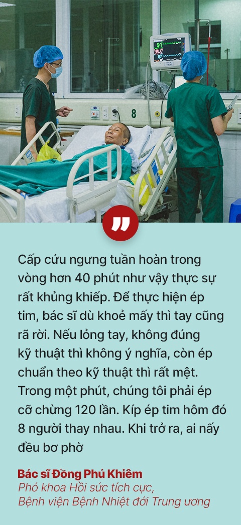 “Bệnh nhân 19 chỉ ngừng tuần hoàn một lần nhưng kéo dài 40 phút. Cấp cứu ngưng tuần hoàn trong vòng hơn 40 phút như vậy thực sự rất khủng khiếp. Để thực hiện ép tim, bác sĩ dù khoẻ mấy thì tay cũng rã rời. Nếu lỏng tay, không đúng kỹ thuật thì không ý nghĩa, còn ép chuẩn theo kỹ thuật rất mệt. Trong một phút, chúng tôi phải ép cỡ chừng 120 lần. Kíp ép tim hôm đó 8 người thay nhau. Khi trở ra, ai nấy đều bơ phờ”, bác sĩ Khiêm kể lại.