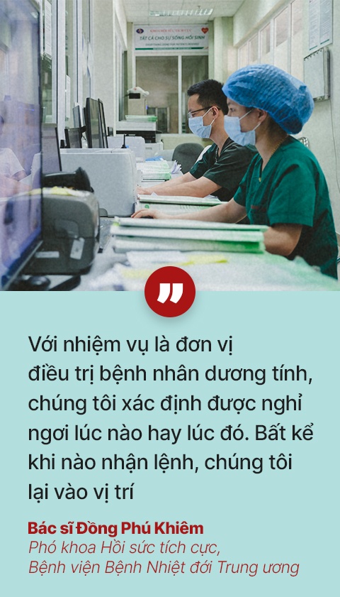 “Hàng ngày, chúng tôi vẫn cập nhật thông tin các ca Covid-19 trong cộng đồng. Ngày đầu tiên không có ca chúng tôi rất vui, cứ thế đến hôm nay là hơn một tháng. Dịch bệnh được nhận định là đang khống chế tốt, chúng tôi mừng lắm. Áp lực anh em giảm bớt đi, mong sao được giảm tải để trở về nhà. Nhưng vui nhất là cộng đồng an toàn. Dù vậy, với nhiệm vụ là đơn vị điều trị bệnh nhân dương tính, chúng tôi xác định được nghỉ ngơi lúc nào hay lúc đó. Bất kể khi nào nhận lệnh, chúng tôi lại vào vị trí”, bác sĩ Khiêm nói.