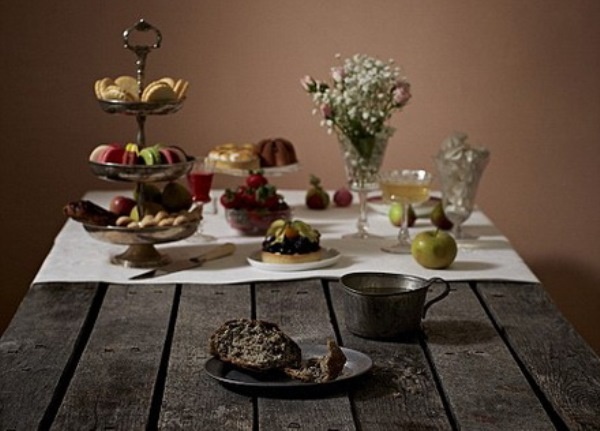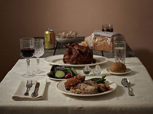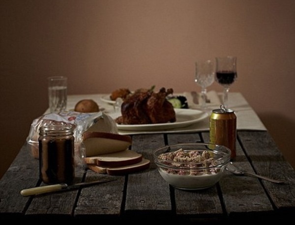 | Bữa ăn của người nghèo và người giàu được đặt trên cùng bàn để cho thấy rõ sự khác biệt. |