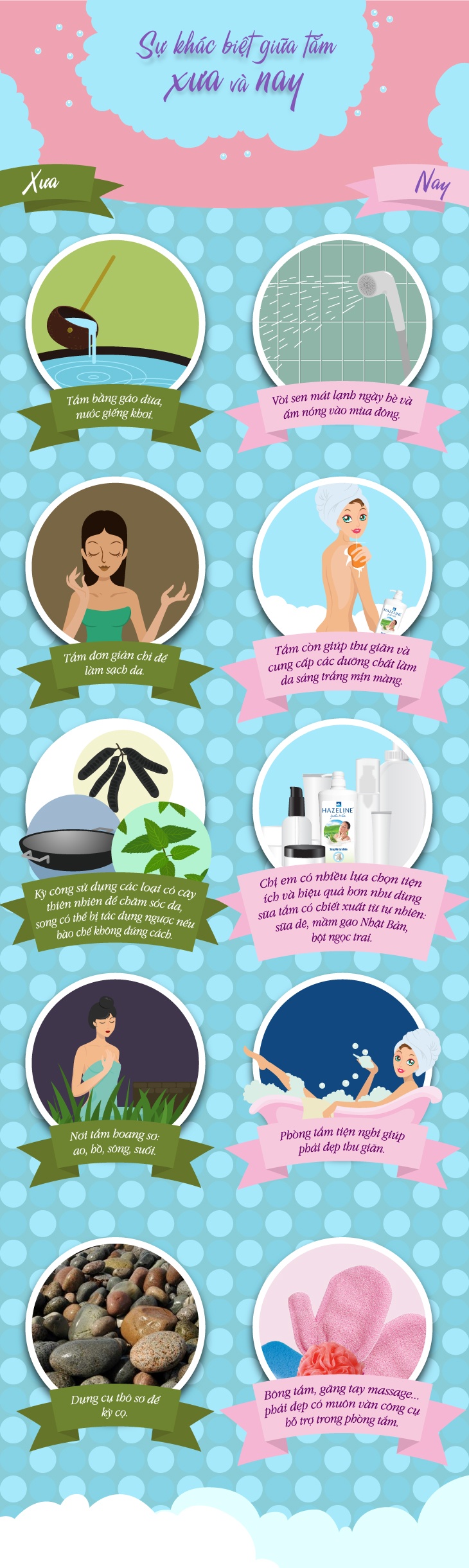 Một vài so sánh nhỏ trong đồ họa dưới đây cho thấy theo thời gian, việc làm sạch, chăm sóc da của phái đẹp đã có rất nhiều cải tiến.