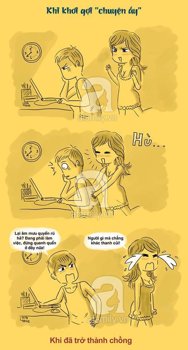 | Khi yêu, lúc nào chồng cũng bóng gió và gạ gẫm "chuyện ấy" bất kể nơi đâu. Còn khi là vợ chồng, nhiều khi vợ khơi gợi chuyện ấy, mặc áo ngủ sexy nhưng chồng cũng không nhận ra hoặc phũ phàng chối từ vì bận. |