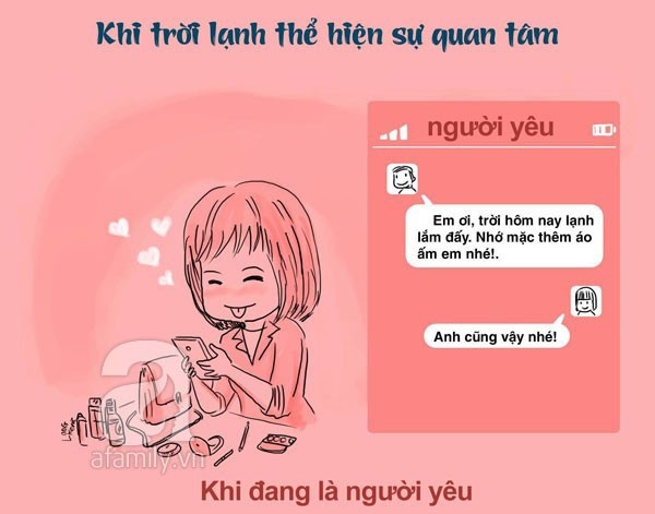 | Khi muốn quan tâm, chồng cũng chỉ nhắc vợ kiểu tự thân vận động, có thân tự lo. Còn khi yêu, lời nhắc thật cụ thể, ấm áp và đong đầy yêu thương. |