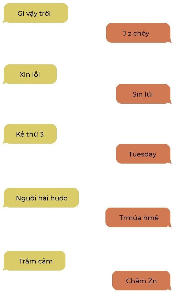Ví dụ, để thay thế chữ “i”, người dùng sẽ sử dụng chữ “j", hoặc chữ “yêu” được rút gọn thành “êu”, “nhắn tin” thành “nt”, “vợ/chồng” thành “vk/ck”...