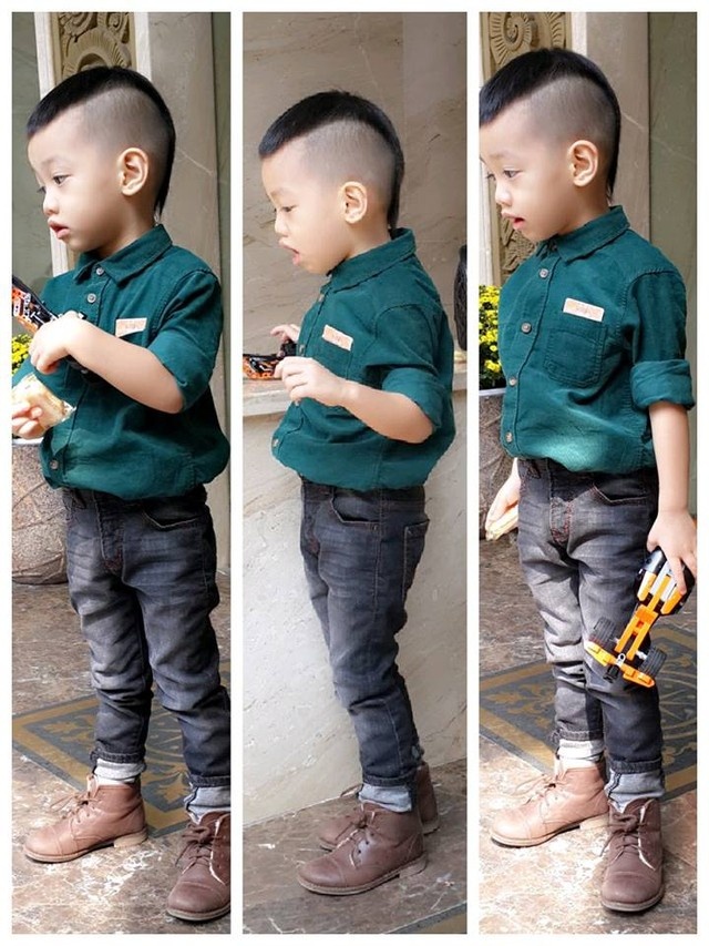Xét về ngoại hình, Subeo thừa hưởng từ mẹ cặp chân dài và nước da trắng sáng. Lợi thế này giúp cậu nhóc dễ dàng diện quần jeans đứng ống. Áo sơ-mi xanh mix đi cùng hài hòa, giày boots cổ ngắn sành điệu không thua kém các tín đồ thời trang.