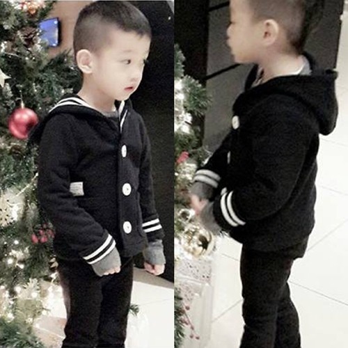Con trai nữ giám khảo X Factor 2014 diện mẫu áo thu đông kiểu thủy thủ, có hàng nút trước ngực áo rất cá tính. Tông màu của quần đi kèm ton-sur-ton với áo. Tổng thể trang phục của Subeo thường gắn liền với 2 tông màu trung tính - trắng đen.