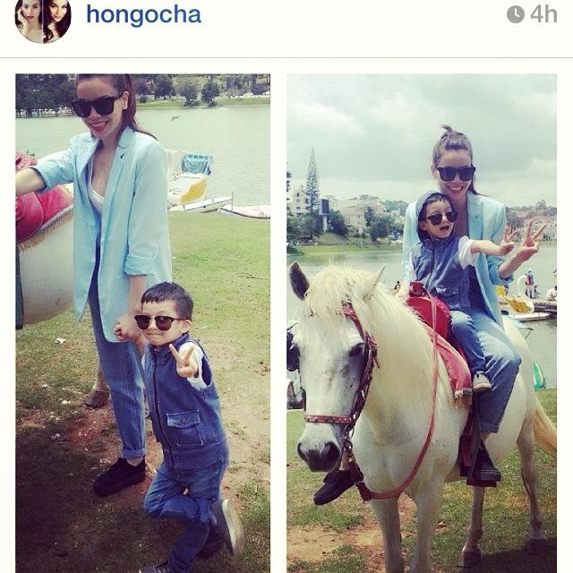 Khi đưa con trai đi nghỉ mát, Hà Hồ thường chọn trang phục chất liệu denim tạo hình ảnh khỏe khoắn, mạnh mẽ. Hai mẹ con nổi bật trong một chuyến du lịch Đà Lạt với bộ denim cực chất.