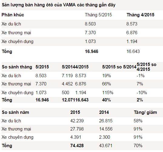 Cụ thể, theo báo cáo của Hiệp hội các Nhà sản xuất ôtô Việt Nam (VAMA), sản lượng bán hàng ôtô trên toàn thị trường tháng 5/2015 đạt 17.921 chiếc, giảm nhẹ 1% so với tháng liền trước. Trong đó, phân khúc xe du lịch đạt 8.946 chiếc, giảm 5,1%; phân khúc xe thương mại đạt 7.796 chiếc, tăng 5%; phân khúc xe chuyên dụng đạt 1.179 chiếc, giảm 10%.