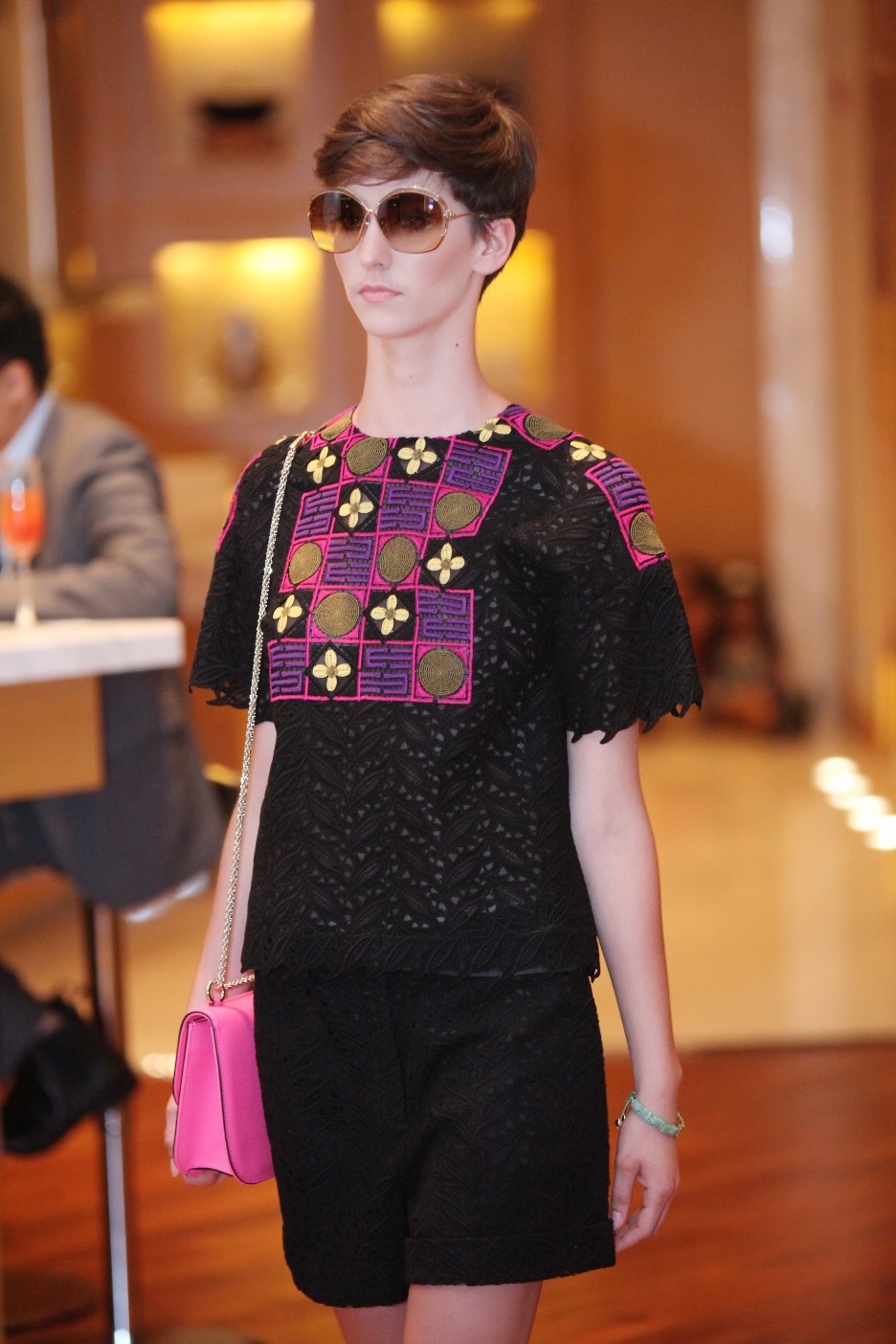 Họa tiết thêu mang cảm hứng Ai Cập thuộc BST xuân - hè 2014 của Valentino, kính Chrome Hearts Fuffer và vòng Shamballa Emerald.
