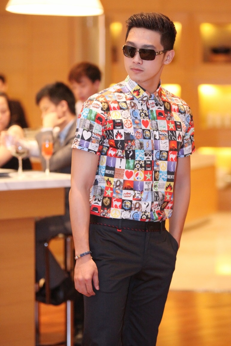 Người mẫu Lưu Huynh trong trang phục mang màu sắc thuộc BST xuân - hè của thương hiệu Moschino đeo kèm chiếc Shamballa Sapphire Limited và kính Chrome Hearts Gummer. Điểm nhấn của bữa tiệc là những chiếc đồng hồ phiên bản giới hạn từ BST của nhà bán lẻ trang sức và đồng hồ xa xỉ Frost of London Việt Nam.