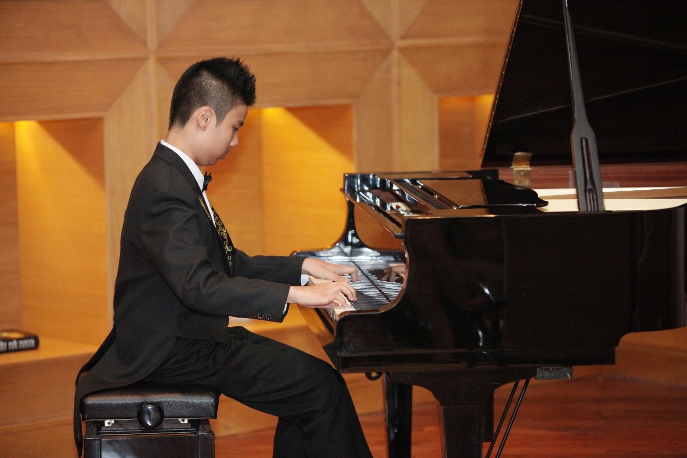 | Thần đồng piano 14 tuổi - Nguyễn Thế Vinh - trong màn trình diễn sâu lắng tại sự kiện. |