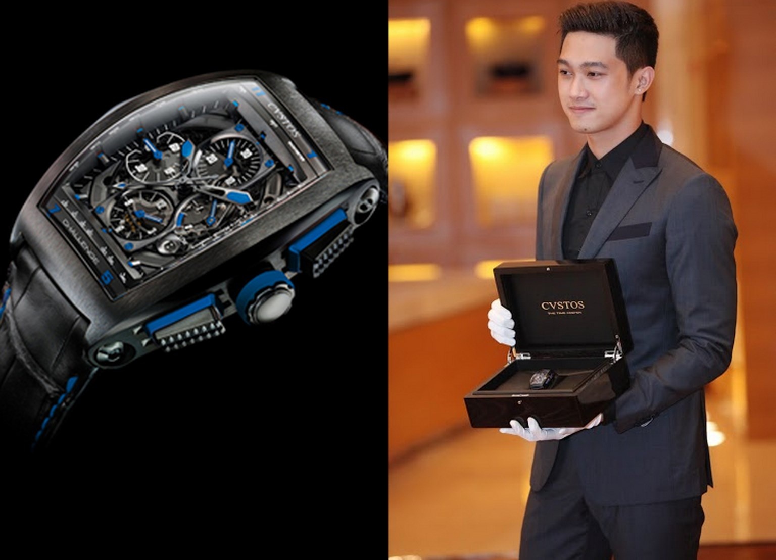 | Người mẫu Lưu Huynh mang trên tay chiếc Cvstos Chrono GP Blue phiên bản giới hạn 25 chiếc trên toàn thế giới. |