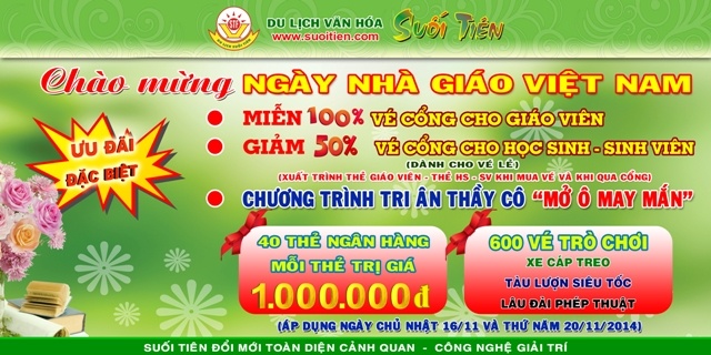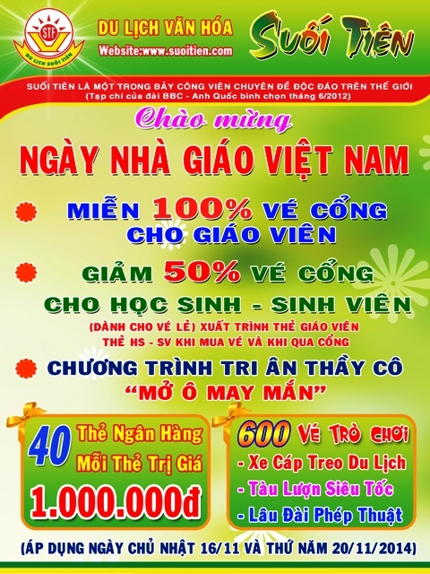 Với truyền thống tôn sư trọng đạo, ngày 20/11 hàng năm là ngày toàn xã hội tôn vinh quý thầy cô giáo vì những đóng góp lớn lao trong sự nghiệp trồng người. Nhân ngày lễ này, Du Lịch Văn Hóa Suối Tiên đặc biệt thực hiện nhiều chương trình tri ân quý thầy cô, với nhiều hoạt động ưu đãi dành cho các thầy cô, các em sinh viên, học sinh diễn ra vào ngày 16/11 và ngày 20/11.