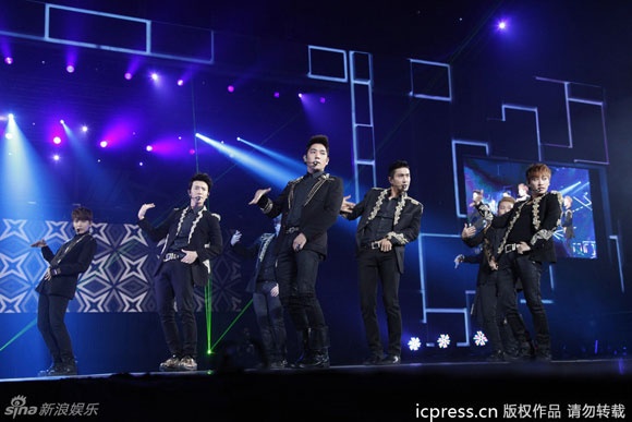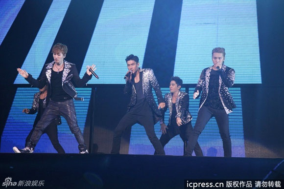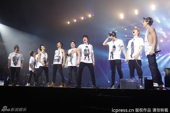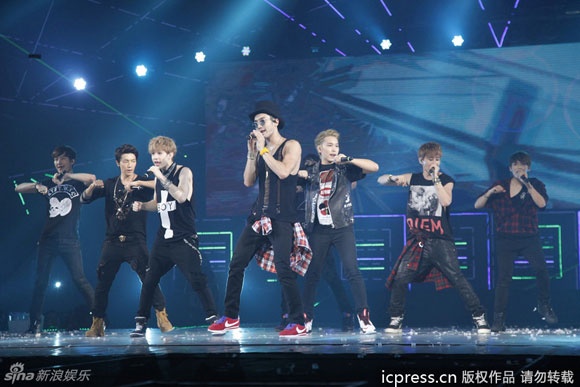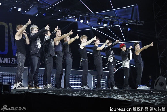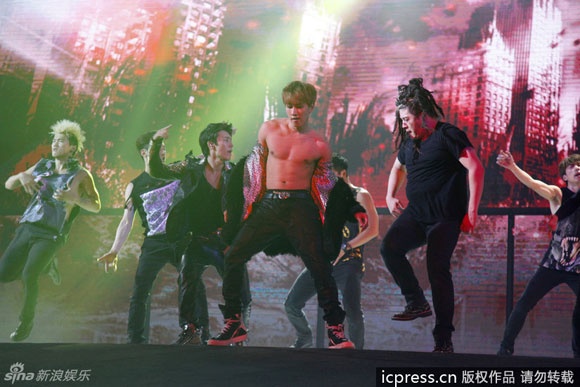 Trong buổi biểu diễn ngày 14/9 tại Quảng Châu, các chàng trai trong nhóm nhạc xứ Hàn khiến fan phát sốt với màn trình diễn giả gái và khoe cơ bụng.