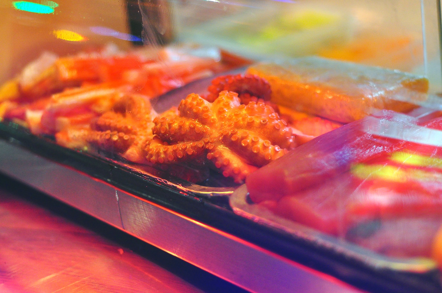 Ẩm thực đường phố luôn thu hút khách bằng việc khách được mục sở thị món ăn và từng bước chế biến. Ở đây, trong tủ kính quầy bán hàng bày rất nhiều cá hồi, bạch tuộc, thanh cua,... Khách nếu tò mò cũng được thấy nhân viên đứng cuốn sushi hay thái sashimi ngay tại quầy.