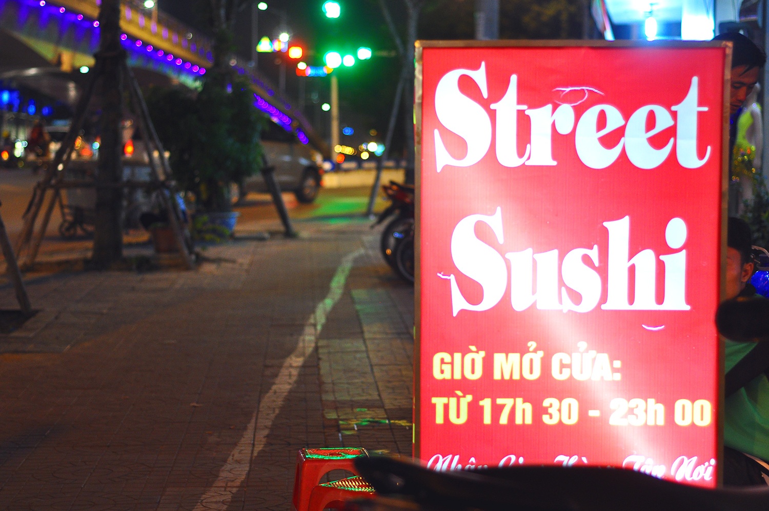 Không mở cửa cả ngày, quán ăn này chỉ bán hàng từ tầm chiều tối đến đêm với hộp biển điện sáng lên dòng chữ "Street Sushi" để thu hút khách đi đường.