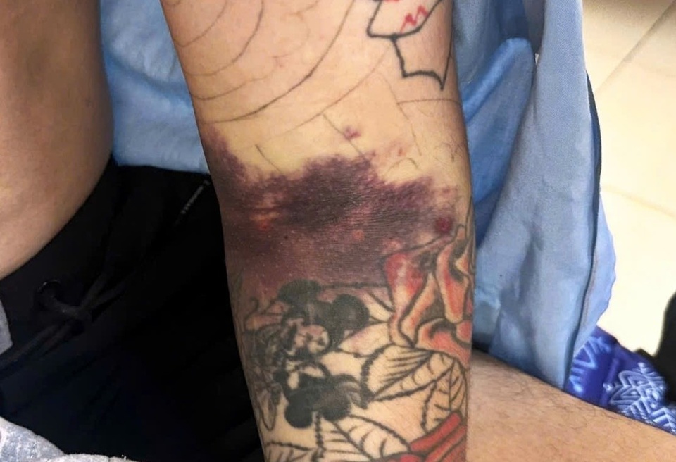 Vùng cánh - cẳng tay trái xuất hiện sưng nề, đau tức, tụ máu và xuất huyết dưới da. Ảnh: BVCC. |