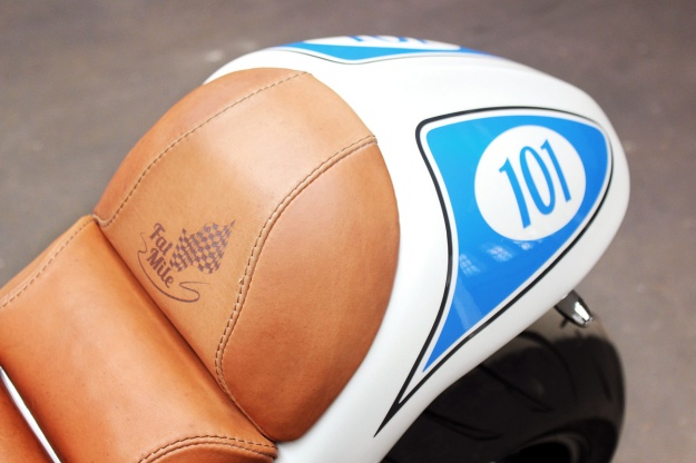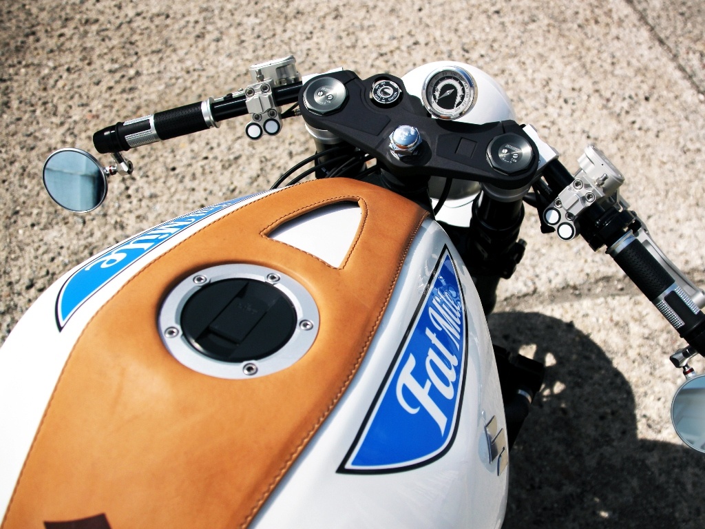 | Bình xăng cũng được cải tiến với một lớp da đắt tiền bọc dọc sống bình xăng. Màu sơn trắng là nét đặc trưng của Suzuki, với hệ thống đèn chiếu sáng của Kellermann, tay lái Rizoma, và đồng hồ đo của Motogadget. |