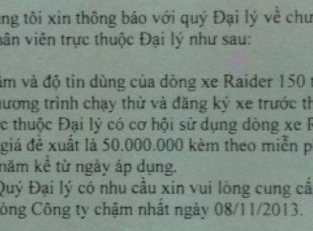 | Suzuki Việt Nam khẳng định bức hình chụp đoạn văn bản của hãng gửi các đại lý, hé lộ giá bán 50 triệu đồng cho mẫu Raider 150 sắp ra mắt, là hoàn toàn giả mạo. |