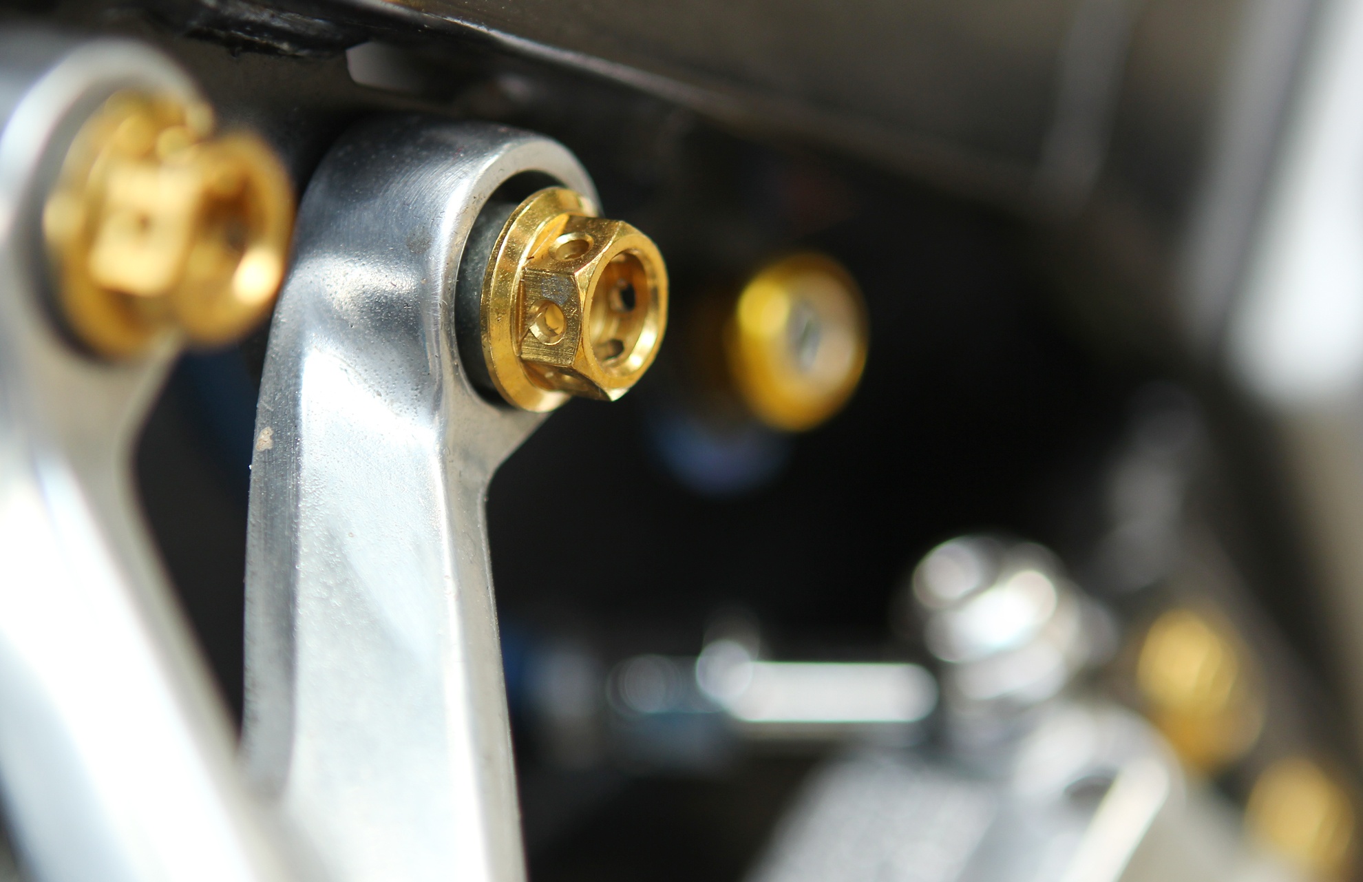 | Giảm xóc trước hành trình ngược, ngàm phanh Brembo cùng loạt ốc proti tô điểm cho bánh trước. |