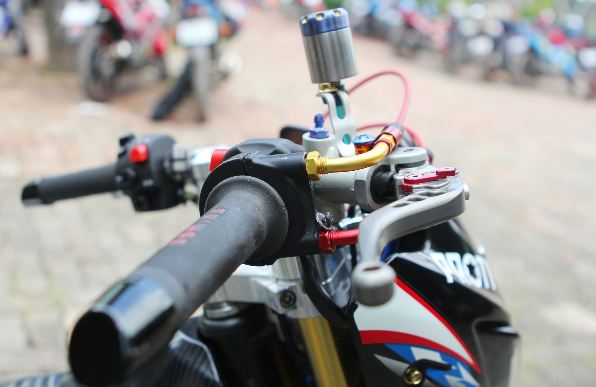 Cụm ghi-đông với cùm tăng tốc domino, tay phanh Brembo, tay côn CRG GP, công tắc Passing Domino. |