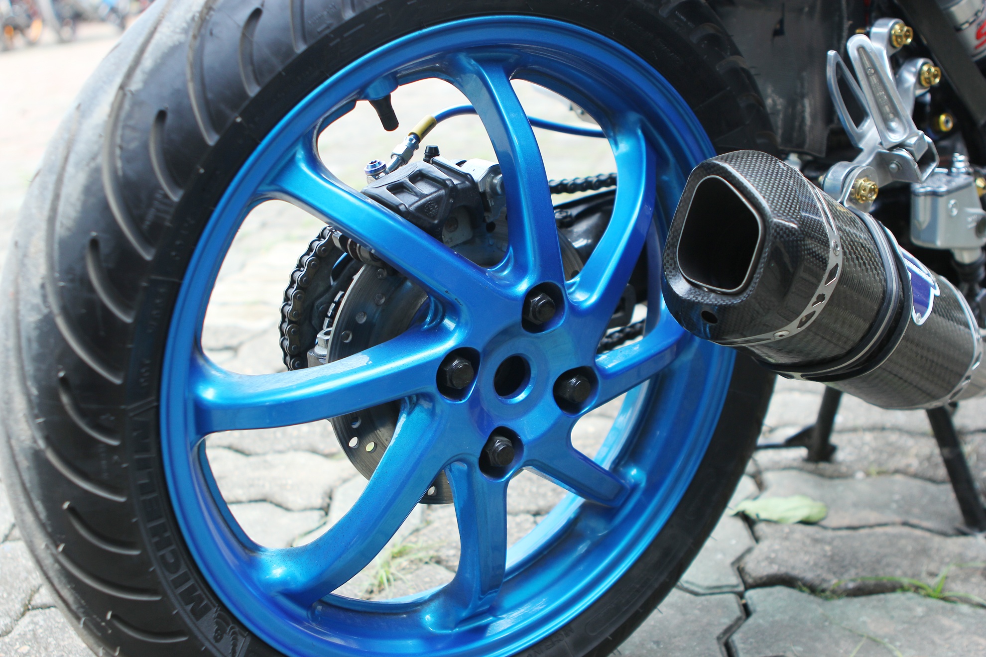 | Chủ nhân chiếc xe cũng thay bộ vành, càng mới NSR cùng lốp Michellin to bản 130mm và ống xả Termignomi. |