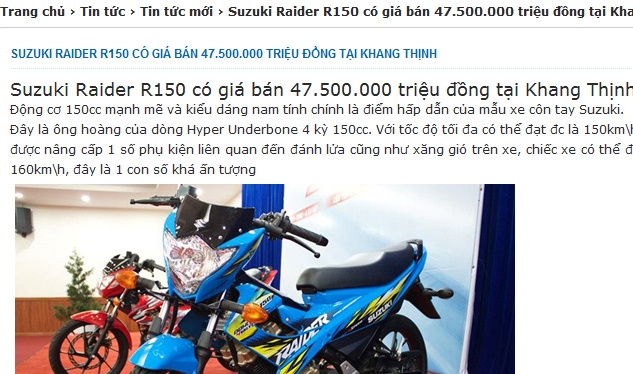 | Thông tin giá bán của Suzuki Raider R150 trên website của một đại lý Suzuki Việt Nam. |