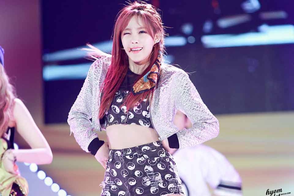 | Tại đây, thành viên Hyomin đã gây chú ý khi diện áo crop top khoe trọn vòng eo con kiến và tấm lưng gợi cảm. |