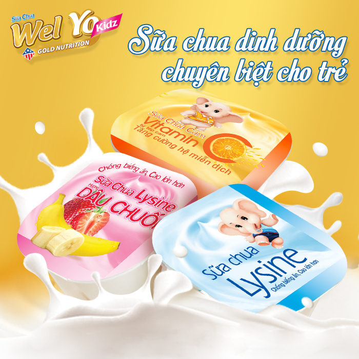 Sữa chua Wel Yo Kid có 3 loại sản phẩm sữa chua dinh dưỡng chuyên biệt cho bé: sữa chua vitamin C - tăng cường hệ miễn dịch, sữa chua Lysine và sữa chua Lysine dâu chuối - chống biếng ăn, cao lớn hơn. Sữa chua Wel Yo Kidz - dinh dưỡng vàng, thế hệ vàng. Mọi chi tiết, độc giả truy cập website: http://wel.vn/ hoặc fanpage www.facebook.com/SuachuaWelYo |