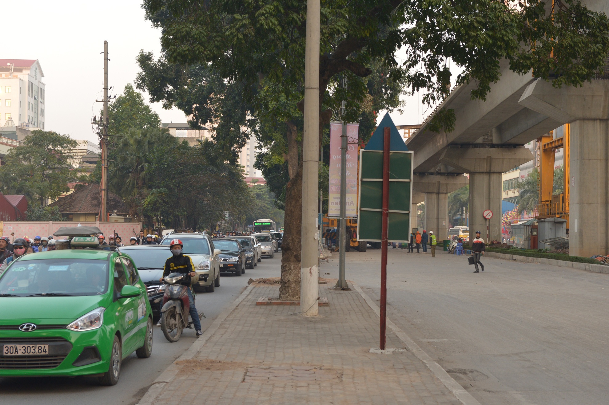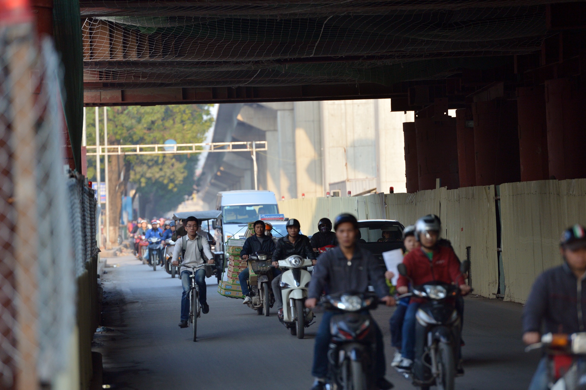 | Tại đoạn Nguyễn Trãi, quận Thanh Xuân vẫn còn một khu vực các thanh dầm giàn giáo thép lơ lửng trên đầu người đi đường. Anh Nguyễn Thanh Hưng, một nhân viên văn phòng nhà ở khu đô thị Xa La, quận Hà Đông cho biết, khi qua khu vực này anh rất lo lắng, "sáng đến cơ quan tôi phải phóng vội khi chui qua đó, muốn né vào đường bên trong mà không có lối rẽ sang", anh tâm sự. |