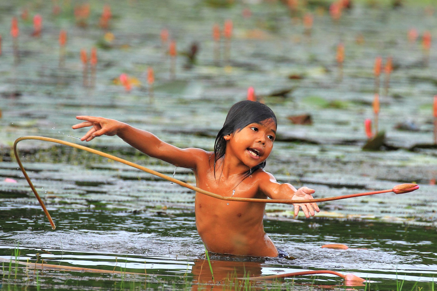 | Bé gái chơi đùa trong hồ nước ở Ankor Watt, Campuchia. Ảnh: Georgia Turnball |