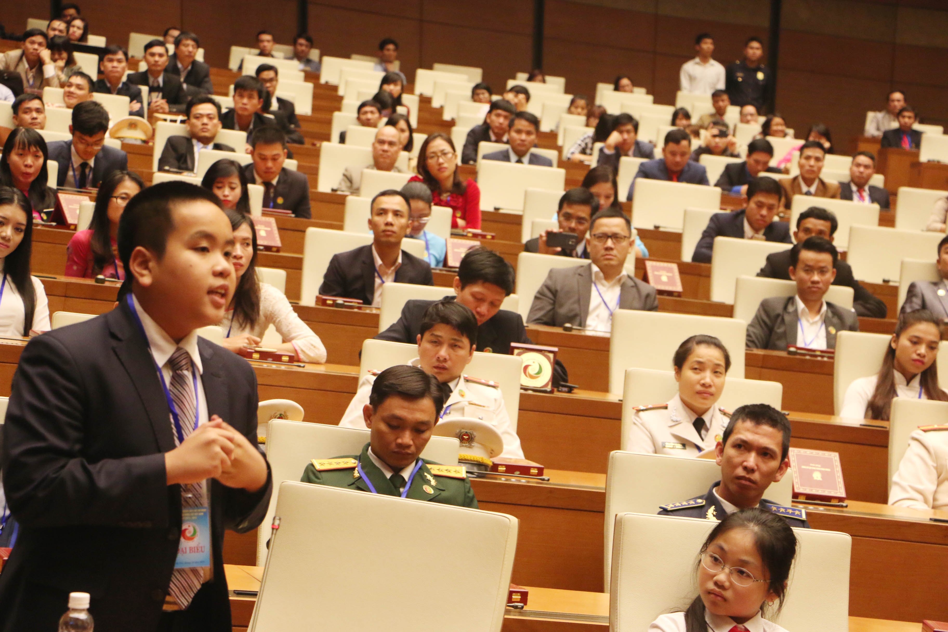 Bước vào phòng Hội nghị với nụ cười thân thiện, Chủ tịch Quốc hội Nguyễn Sinh Hùng bắt tay các đại biểu nhỏ tuổi như "thần đồng" Đỗ Nhật Nam, tài năng âm nhạc Quách Hoàng Nhi. Ông nán lại hỏi thăm về nơi các đại biểu nhỏ tuổi đang học, sau đó mới lên hàng ghế Chủ tịch.