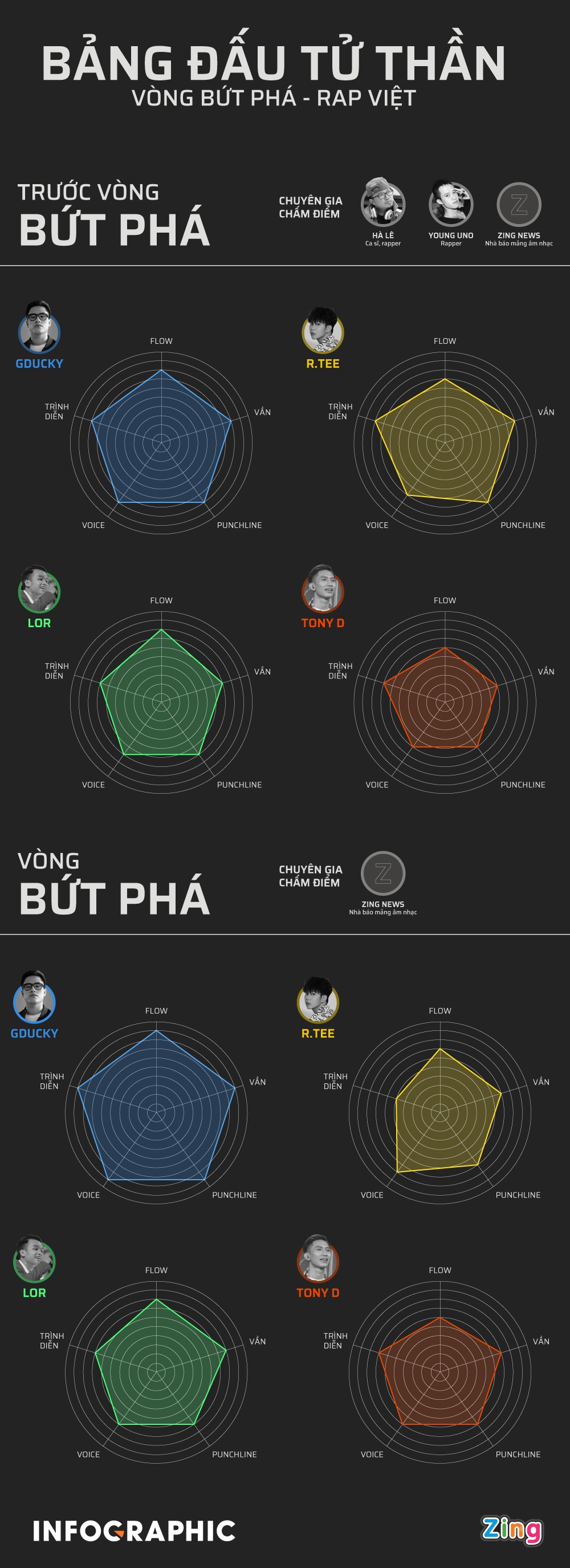 Sự toàn diện của "ngũ giác" kỹ năng, bao gồm flow, vần, punchline, chất giọng và trình diễn đã giúp GDucky đại thắng trong vòng Bứt phá, tiến vào chung kết Rap Việt.