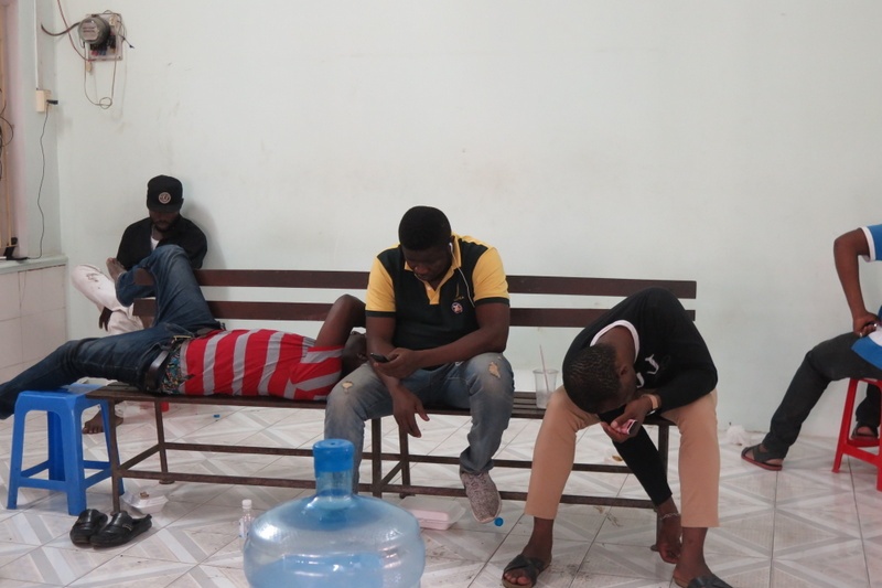 Trong phòng chờ làm việc, một số người nằm lên ghế ngủ. Một số thì đứng bên cửa sổ nhìn ra ngoài. Khi cơ quan chức năng làm việc, có một số phụ nữ Việt Nam mang giấy tờ liên quan đến những người nước ngoài đến trình diện.