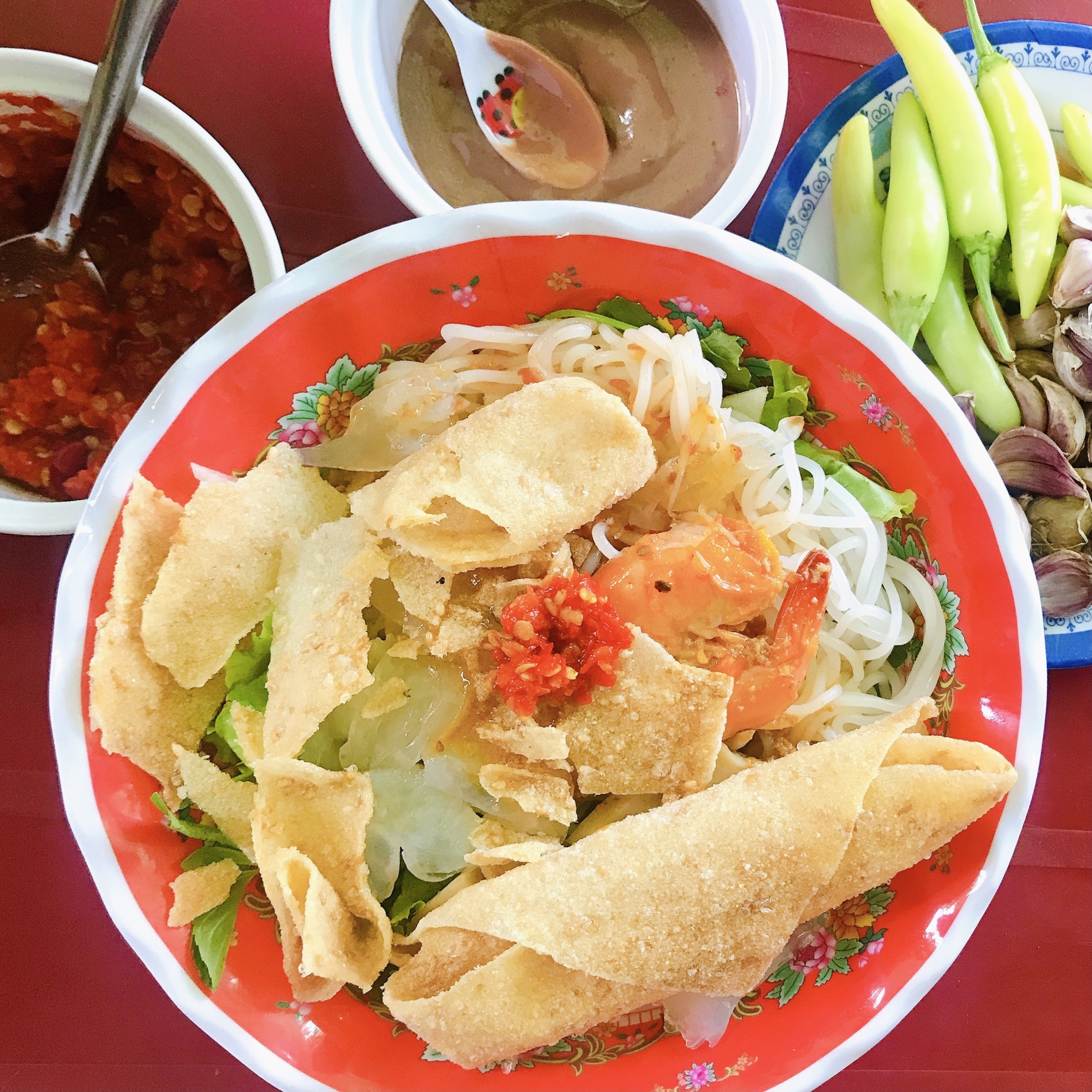 Món ăn giá bình dân chỉ từ 10.000 đồng/tô, song được chế biến rất kỳ công, tỉ mỉ. Sợi nấu từ bột gạo pha bột lọc theo tỷ lệ 3:1. Nhân tôm và thịt ba chỉ được giã bằng tay, vo viên tạo thành những miếng chả đỏ gạch đẹp mắt. Khi thưởng thức, bạn có thể cho thêm nước mắm ruốc cay cay để kích thích vị giác.