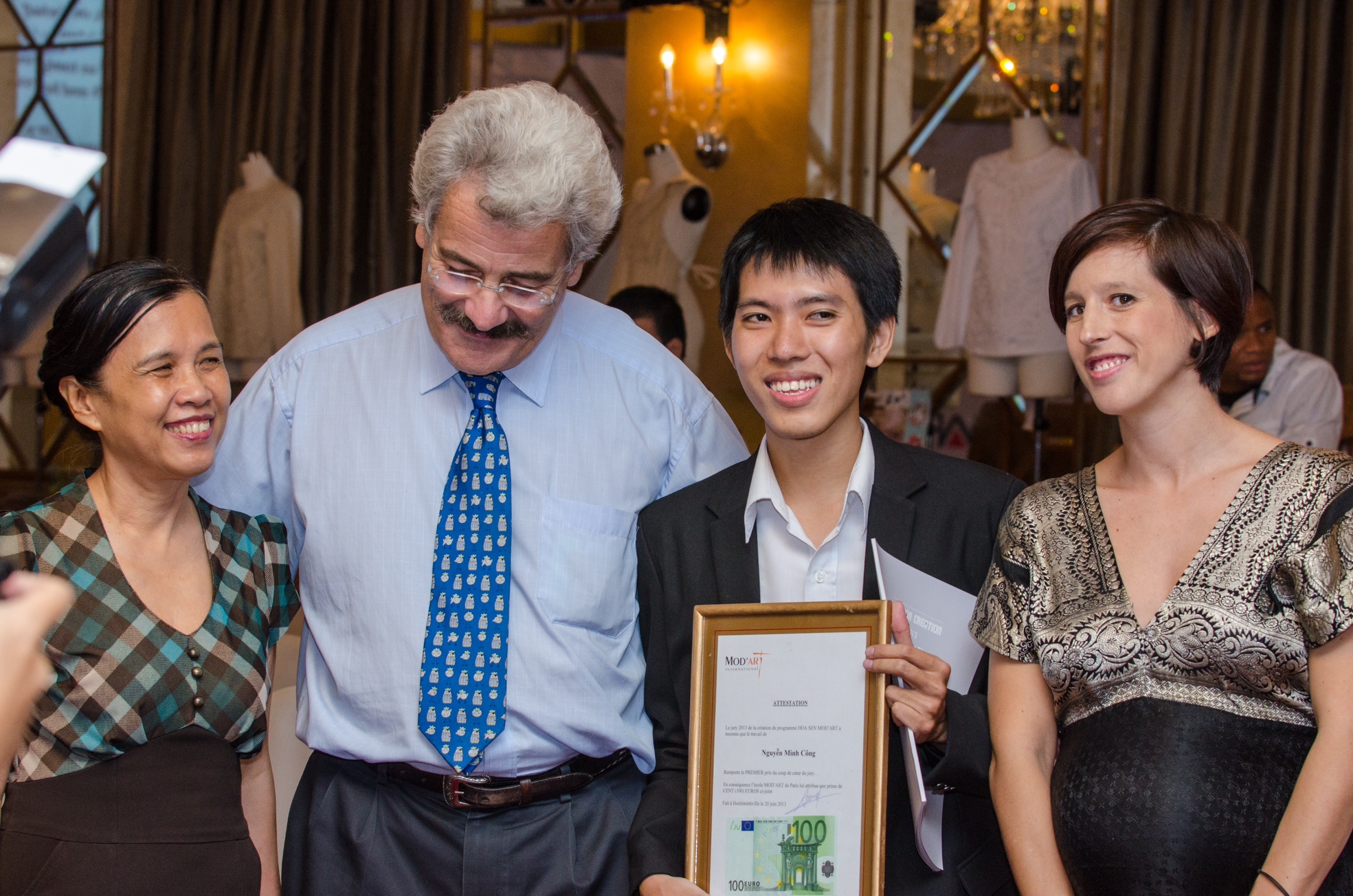 | Hiệu trưởng ĐH Hoa Sen - TS.Bùi Trân Phượng (trái), và ông Afred Mahdavy, Phó viện trưởng Viện đào tạo quốc tế Thời trang Quốc tế nghệ thuật và Thời trang ModA'rt (Paris) trao thưởng cho sinh viên. |