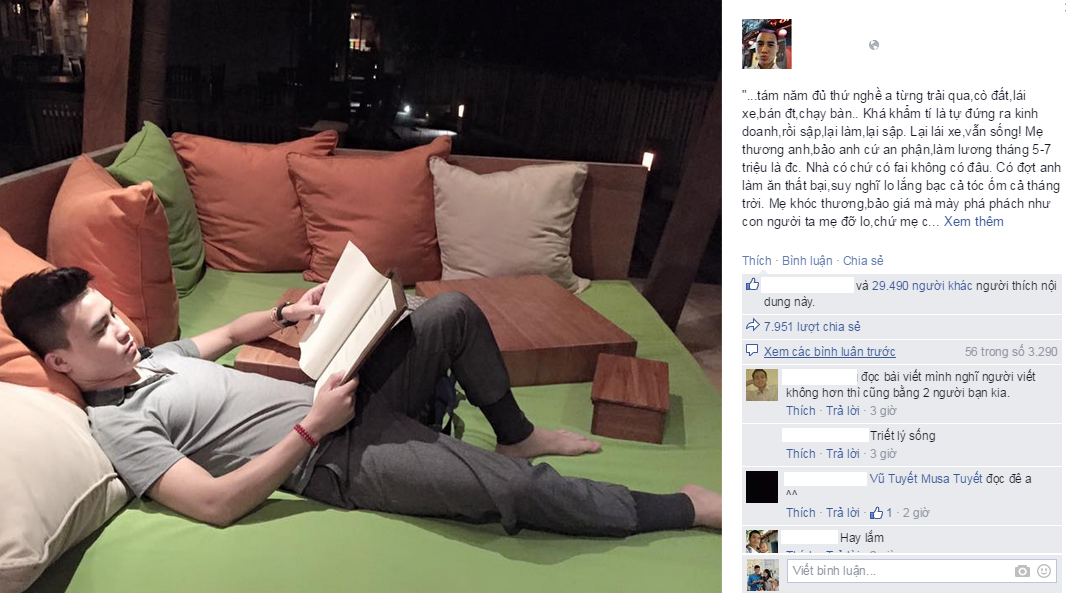 Tài khoản có tên Minh Luc mới đây đăng tải bài viết về ý chí lập nghiệp của phái mạnh thu hút gần 30.000 like (thích), 8.000 chia sẻ và hàng nghìn bình luận.