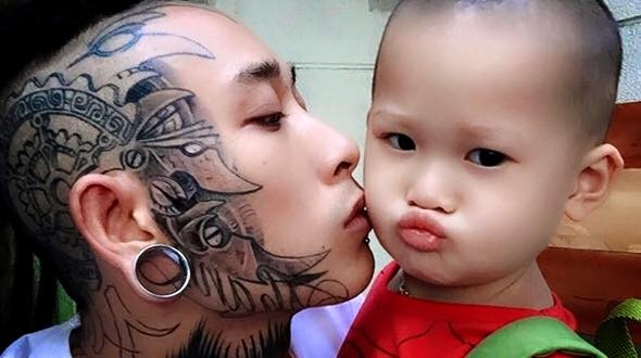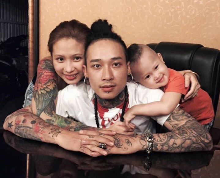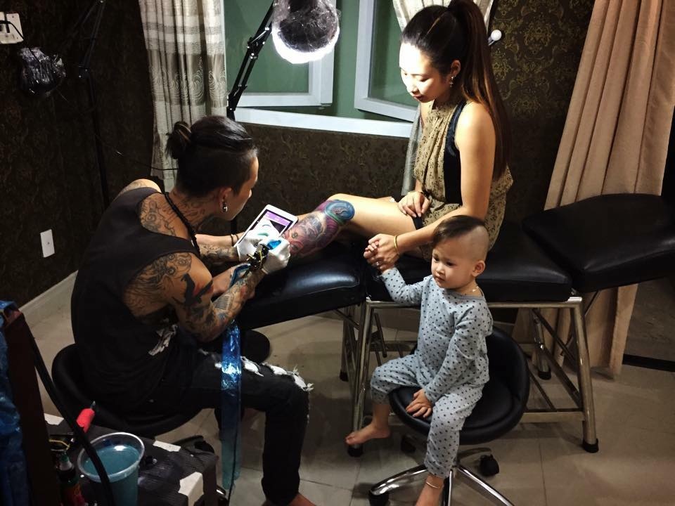 | Hình ảnh con trai Ngọc Tân nắm tay mẹ cho bố xăm hình từng gây chú ý trên mạng. |