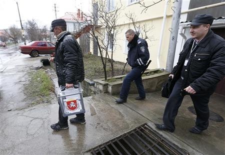 | Hai cảnh sát hộ tống một quan chức khi ông xách hòm phiếu lưu động tới từng nhà trong làng Pionerskoye thuộc ngoại ô thành phố Simferopol hôm 16/3. Ảnh: Reuters |