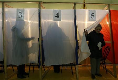| Một phụ nữ vén rèm để ra ngoài sau khi bỏ phiếu tại thành phố Simferopol. Ảnh: Reuters |