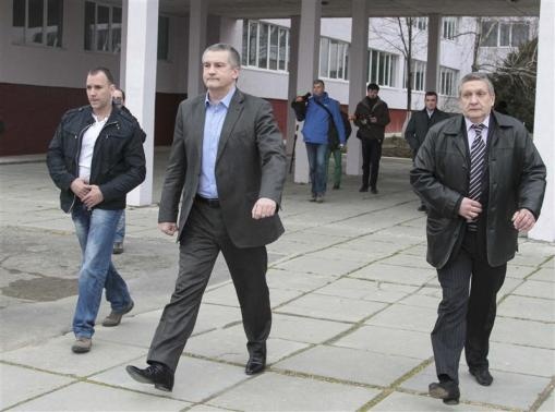 Thủ tướng Crimea Sergei Aksyonov (giữa) rời khu vực bỏ phiếu ở thủ phủ Simferopol hôm nay. Theo kết quả của một cuộc thăm dò dư luận hồi đầu tuần ở Crimea, hơn 90% người dân địa phương ủng hộ Crimea trở thành một phần lãnh thổ Nga. Ảnh: Reuters.