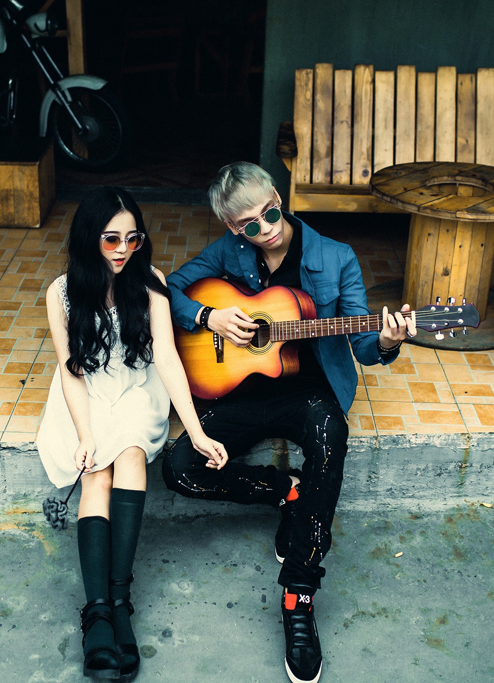 | Cả hai đều là bạn thân ngoài đời nên dễ dàng diễn xuất ăn ý trong bộ ảnh. Kop hóa thân làm chàng trai lãng mạn, chơi đàn guitar cạnh bạn gái. Nữ diễn viên Gia đình ngũ quả diện đầm trắng trong trẻo, nữ tính. |