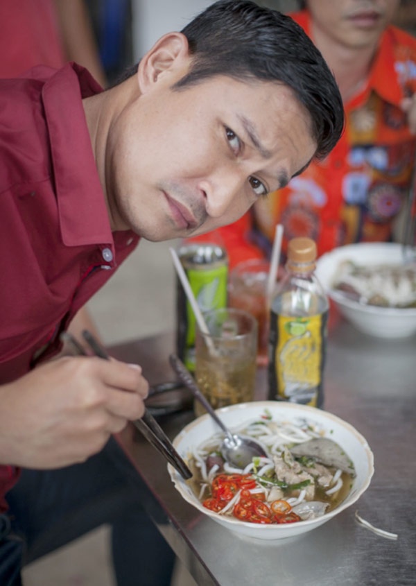 | Huy Khánh với tô phở đầy ớt trước khi diễn. |
