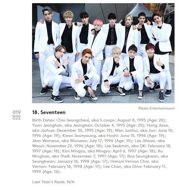 Ngày 1/11, Billboard đã công bố danh sách “21 under 21” và tân binh Seventeen đã vinh dự đứng ở vị trí số 18. Nhóm được miêu tả: “Nếu Seventeen không trở thành ban nhạc Kpop lớn nhất thì họ cũng có thể để lại dấu ấn như là một nhóm đông thành viên nhất nhì làng nhạc Hàn."