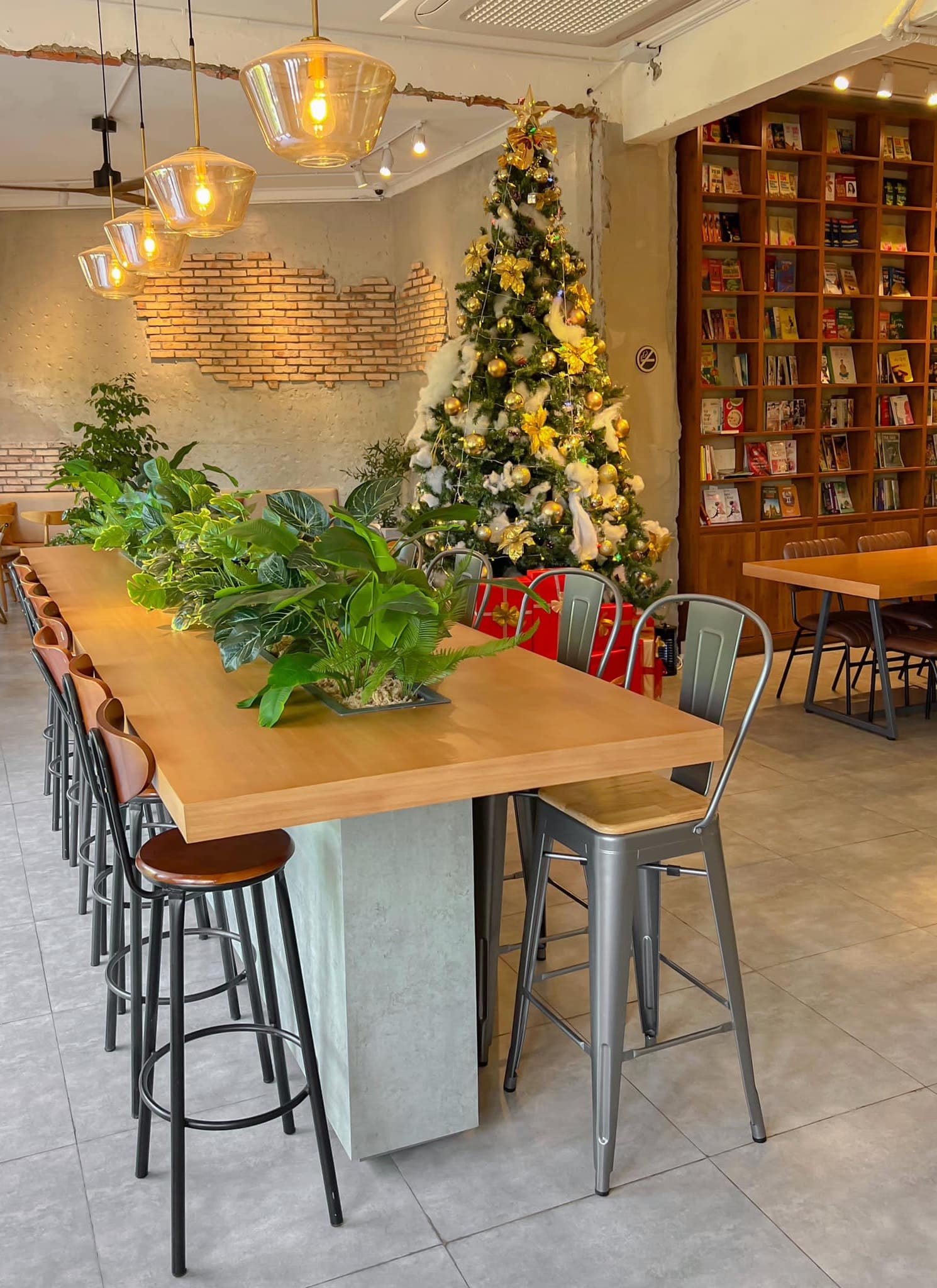 Đúng như tên gọi, quán sở hữu lối thiết kế đơn giản. Bù lại không gian rộng rãi, nổi bật với kệ sách lớn. Nhiều chỗ ngồi riêng tư cho bạn làm việc cá nhân hay dãy bàn dài để họp nhóm. Điểm nhấn là góc ban công với nhiều cây xanh mát. Từ đây, bạn có cơ hội ngắm nhà thờ Huyện Sĩ với cảm hứng rất riêng trong mùa Noel.
